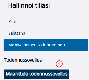Jos haluat ottaa käyttöön monivaiheisen todentamisen (MFA), määrittele todennussovellus puhelimeesi esimerkiksi skannaamalla palvelun QR-koodi. Seuraa sivulla näkyviä ohjeita määrittelyn eri vaiheissa. Määrittämällä todennussovelluksen voit lisätä sisäänkirjautumiseen ylimääräisen vahvistuksen. Kun se on käytössä, salasanan antamisen jälkeen tulee antaa myös todennusskoodi puhelimesi todennussovelluksesta.