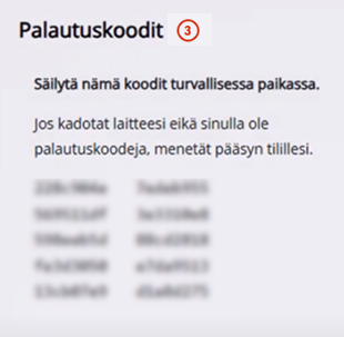 Huomautus:Muista ottaa talteen saamasi palautuskoodit, joita tarvitset, jos kadotat todentamiseen käyttämäsi laitteen.